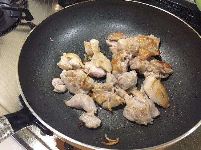 続いて鶏肉を入れて色が変わるまで火を通します