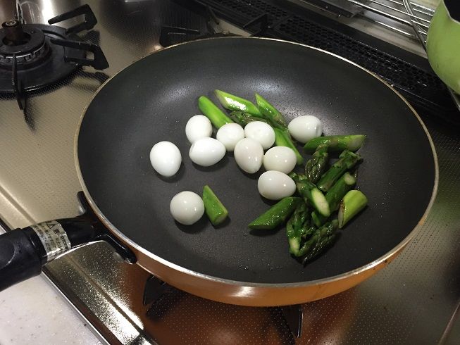 フライパンはキッチンペーパーでサッと拭いてまたサラダ油で今度はアスパラを