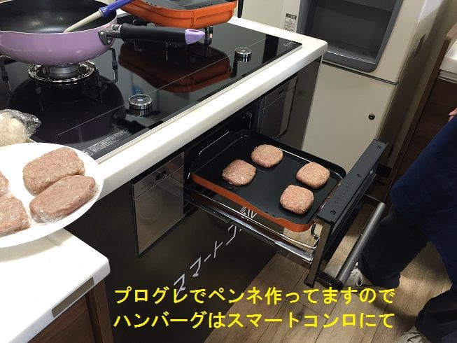 の、ペンネの加熱中にもう1台のコンロでハンバーグを作る!