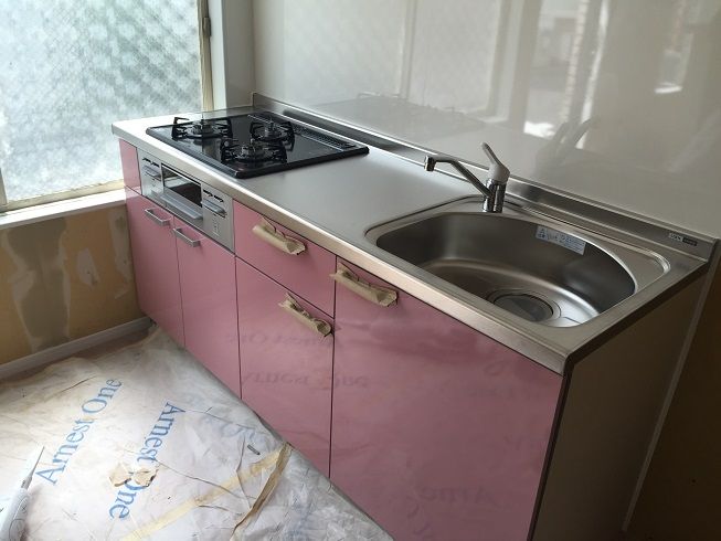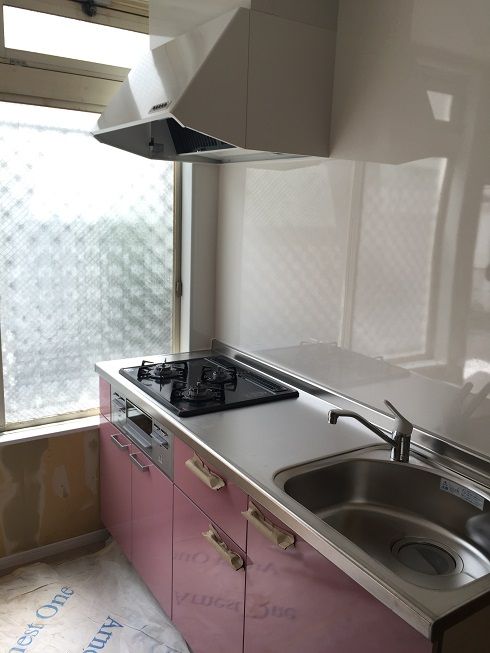 施主様のご希望でキッチン扉カラーはピンク系です