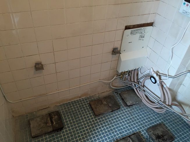 浴槽を固定し、各種配管を結び完了です