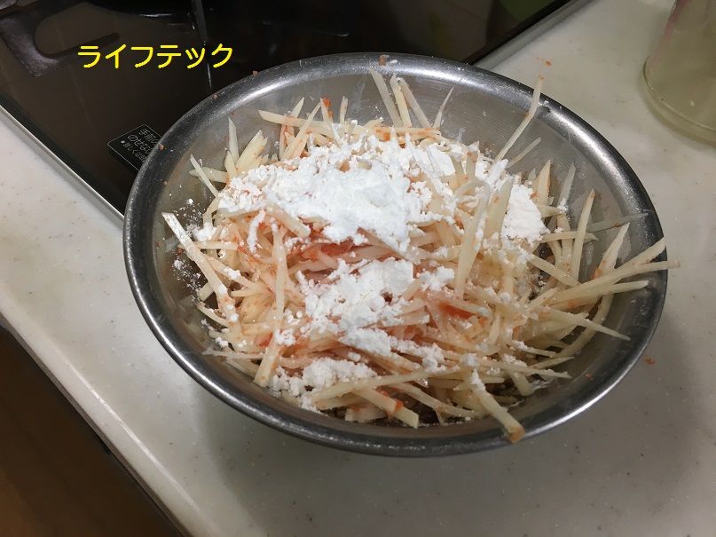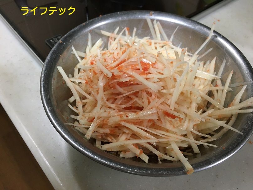 まず、ジャガイモ2個を千切りにします