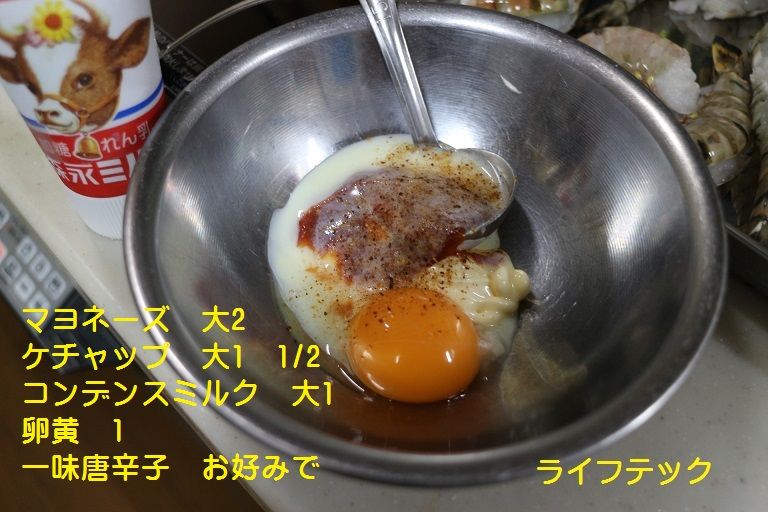 マヨネーズ・ケチャップ・コンデンスミルク・一味唐辛子・玉子1個