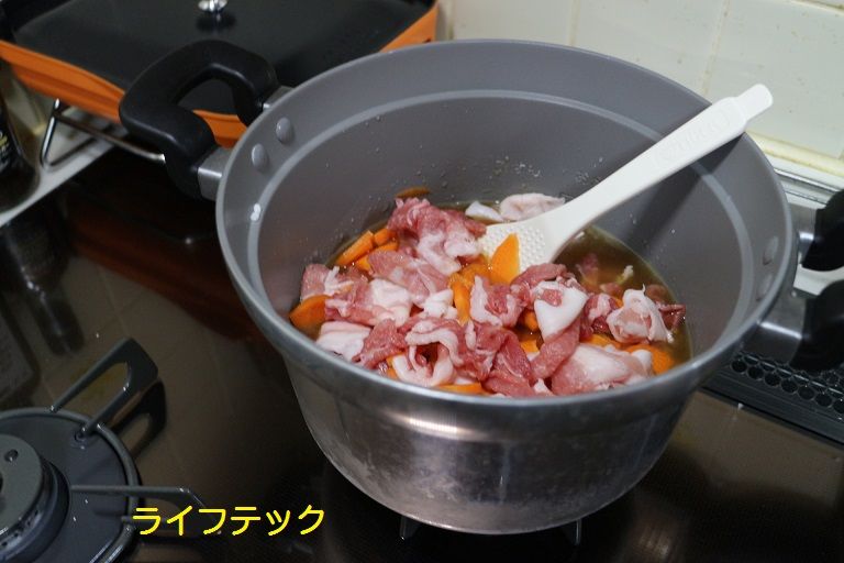 たれとご飯を混ぜたあと、一口大に切った豚肉とニンジン(半月切とイチョウ切)を
