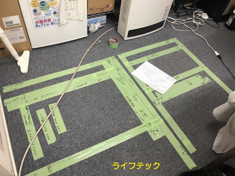 事務所の床にテープで実寸大の図面作ってプランを練る!の図