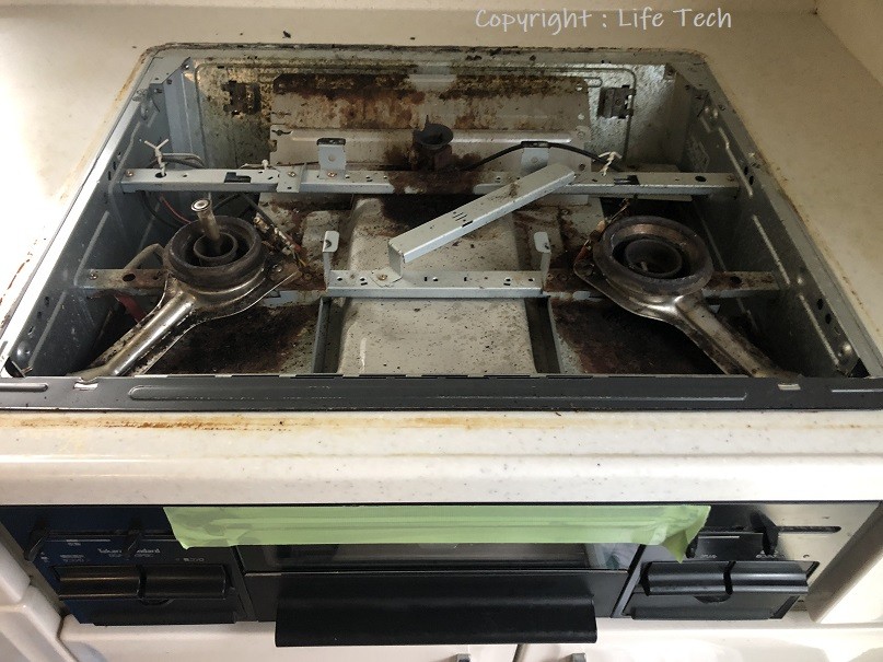 汁受け皿があるコンロだとこのように内部に入り込んじゃってます