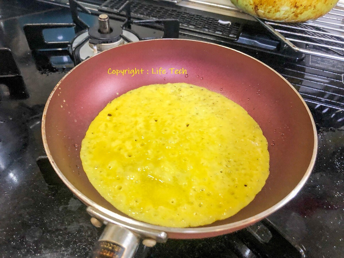 多めに油をひいて 米粉・水・ターメリックを混ぜ混ぜして半分投入