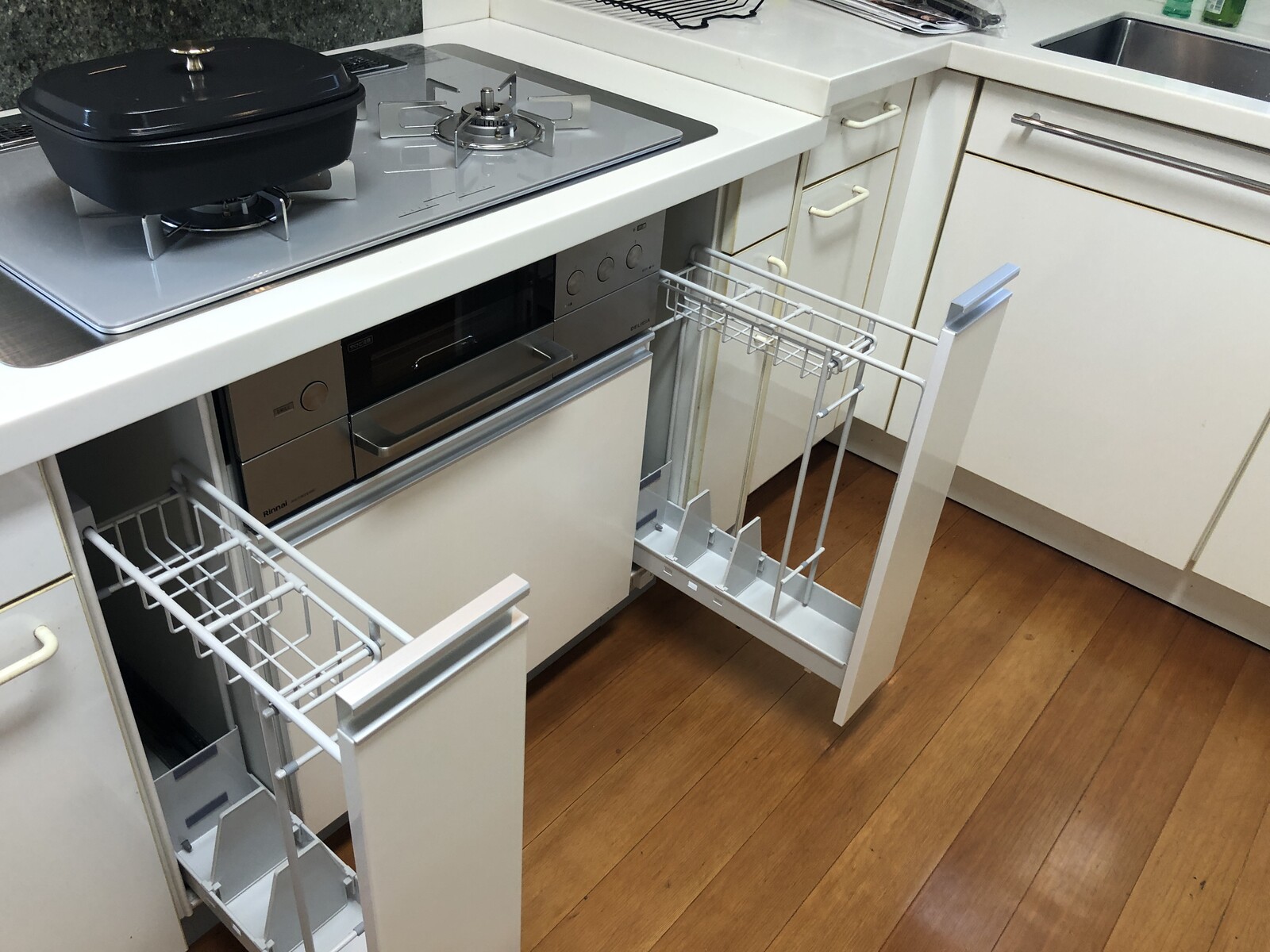 これ、コンロの下も 両脇の15cm収納も新たに加工設置した物