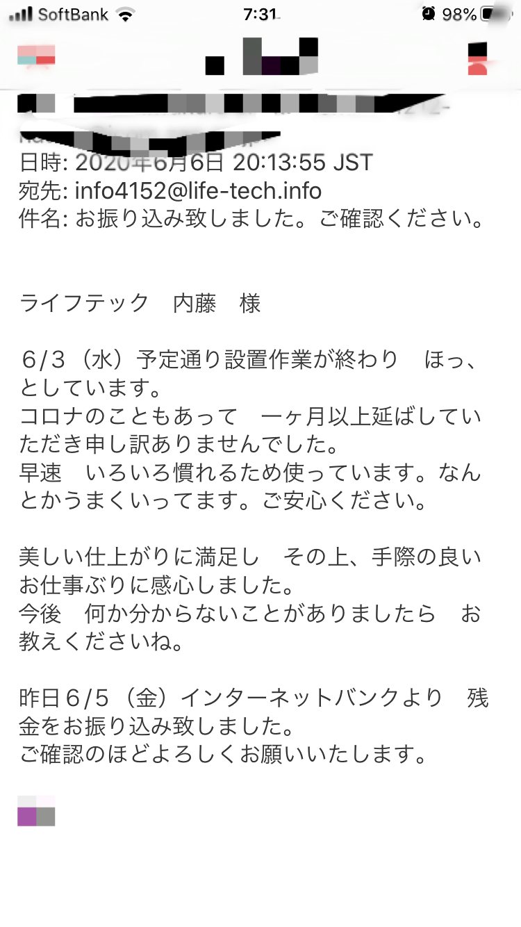 この度はライフテックにご用命いただき誠にありがとうございました