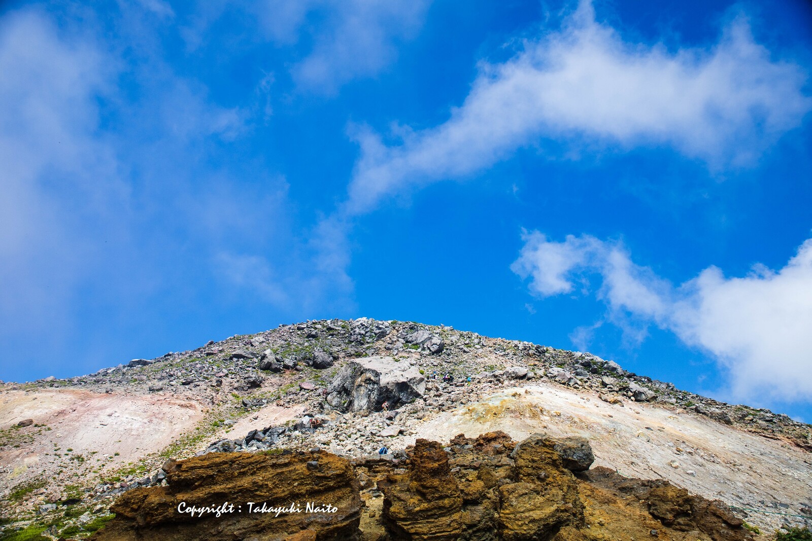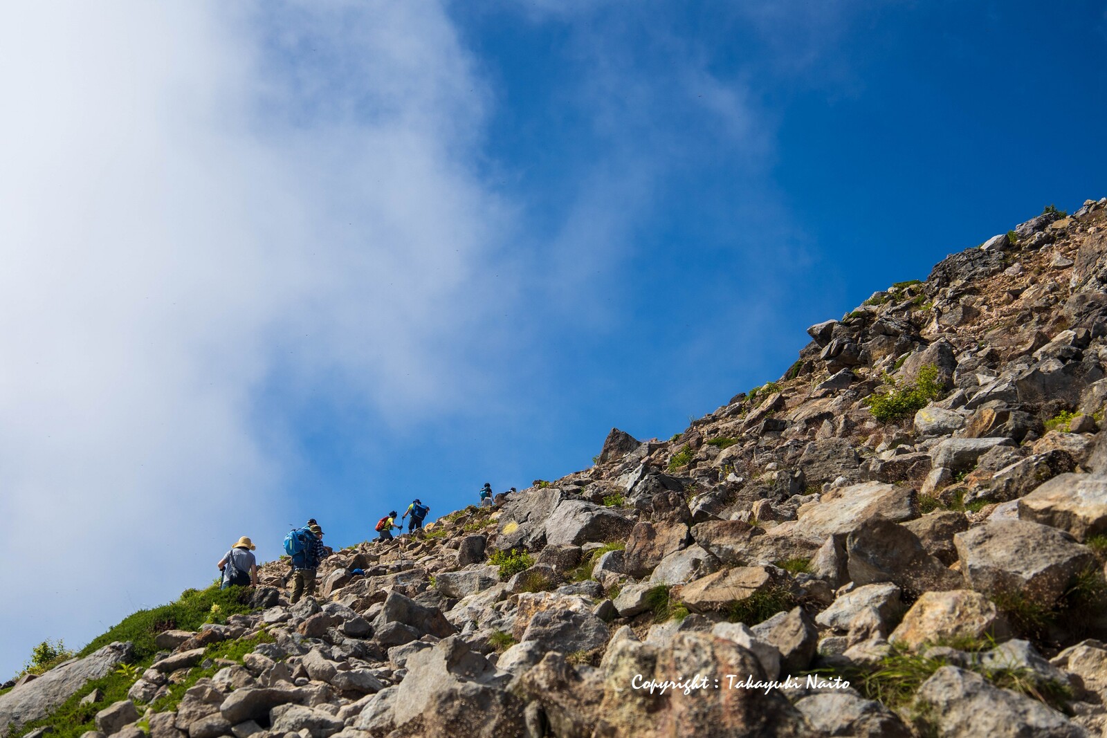 20分も歩くとすでに森林限界?山肌と青空が迎えてくれます