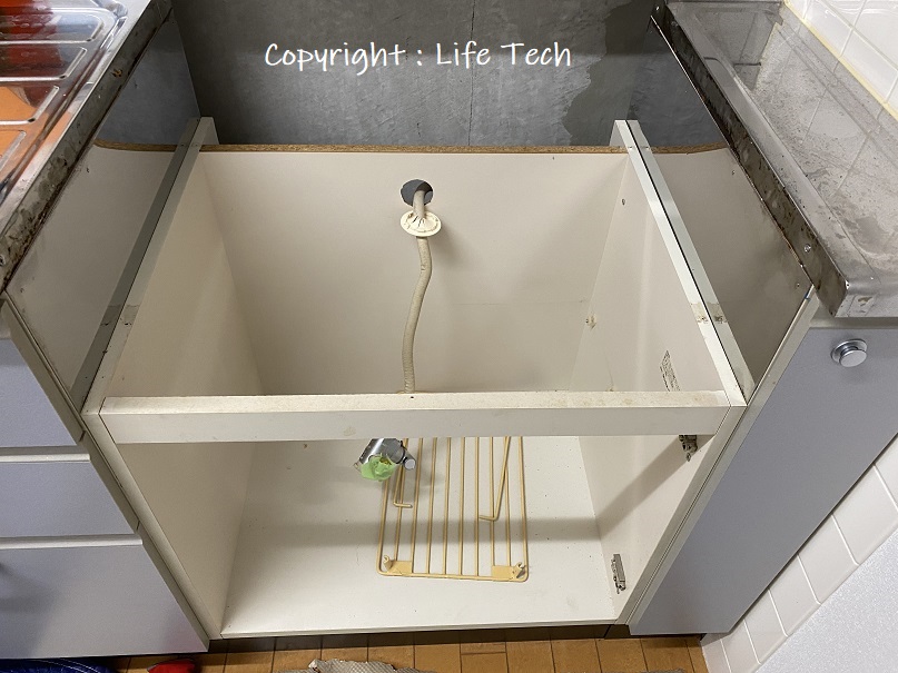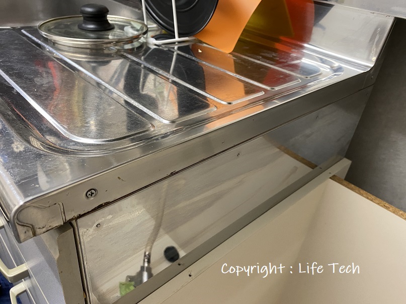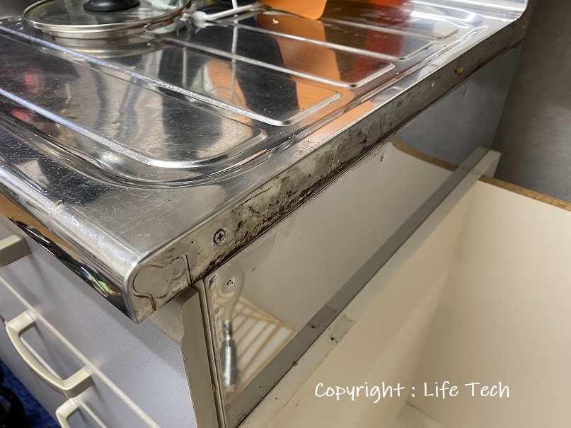左右のキャビネットとの隙間に貼られたアルミテープの跡だって