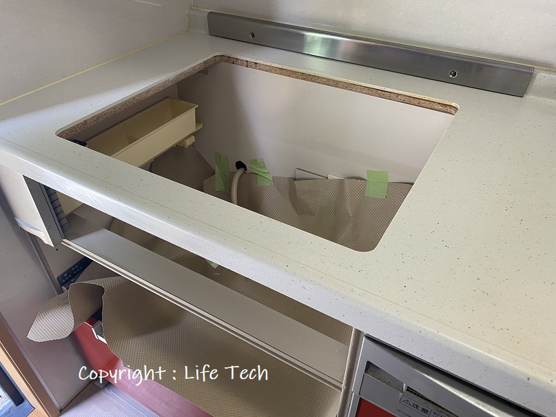 2段収納でしたので下のキャビネット上にも養生敷いてます
