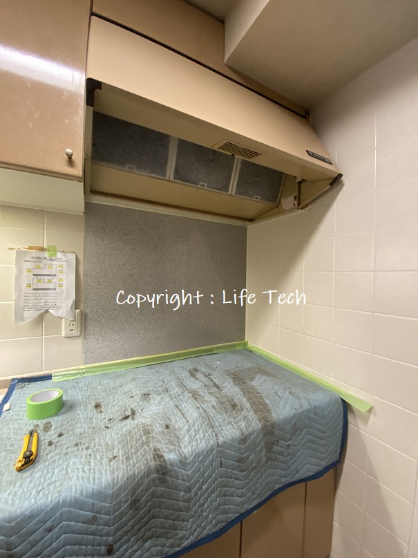 コンロも交換いたしますがきっちり養生からスタートです