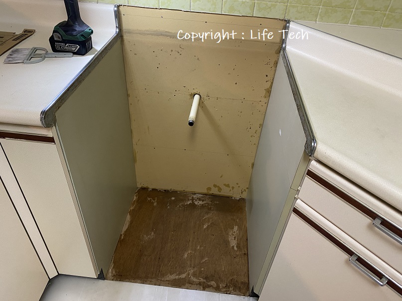 左右のキャビネットサイドと床を清掃しガス配管位置を測りキャビネットに穴あけ