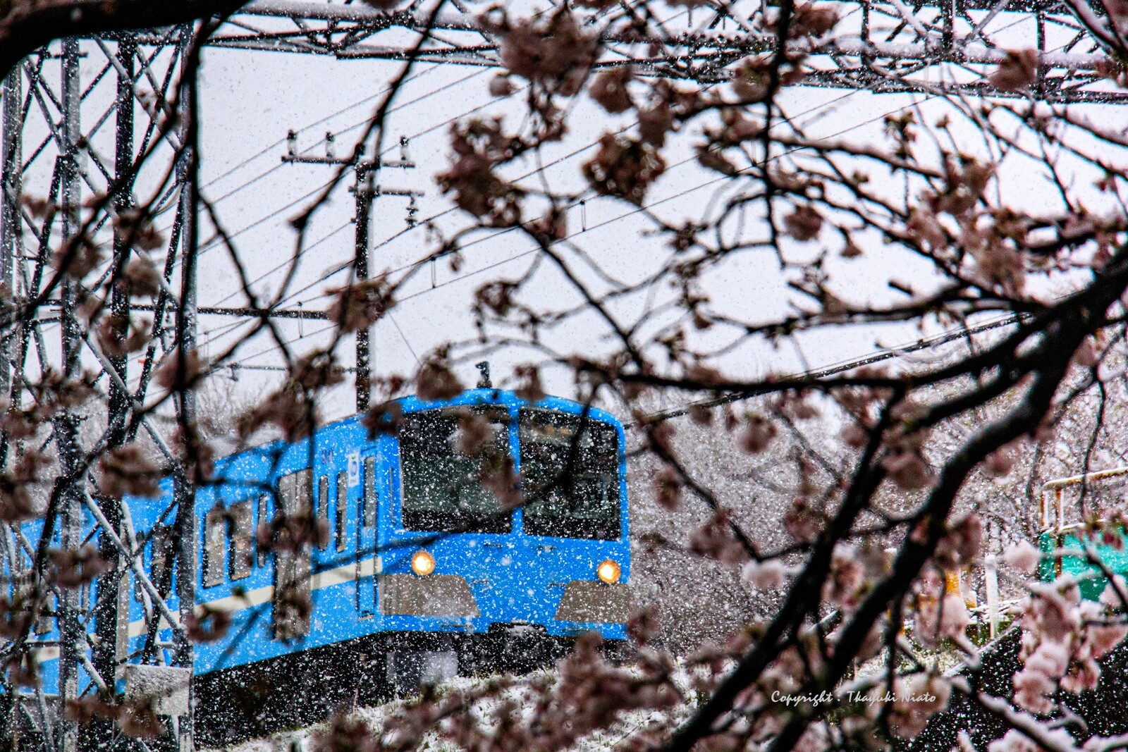 白い雪に真っ青な「湖風号カラー電車」