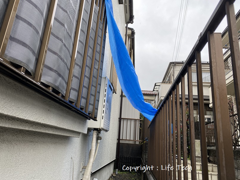 雨降ってますので、ブルーシートで少しでも雨避けをいたします